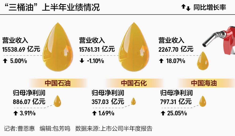 根据中报,今年上半年,中国石油、中国石化和中国海油分别实现营业收入约1.55万亿元(人民币,下同)、1.58万亿元、2267.70亿元。其中,中国石化报告期内营收同比下滑,中国海油营收增速达到18.07%。在归母净利润方面,中国石油、中国石化、中国海油均较去年同期有所上升,分别为886.07亿元、357.03亿元、797.31亿元。而增速最快的是中国海油,归母净利润同比增长25.05%。